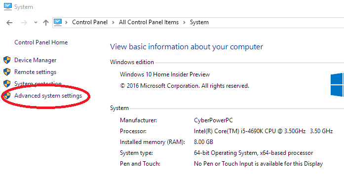 U kontrolnoj tabli, idite na sistem i kliknite na Advanced Sistem Settings da biste otvorili prozor Sistem Properties.